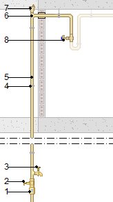 Muntant de 12 m de longitud, col·locat superficialment i fixat al parament, format per tub de polietilè reticulat (PE-Xa), sèrie 5, de 20 mm de diàmetre exterior, PN=6 atm i 1,9 mm de gruix, subministrat en rotllos; purgador automàtic d'aire de llautó i aixeta de pas d'esfera de llautó niquelat. Inclús material auxiliar para muntatge i subjecció a l'obra, accessoris i peces especials. | ||